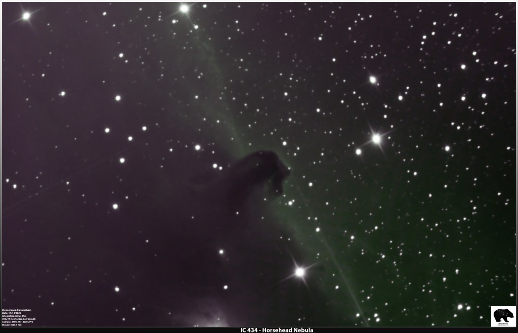IC 434 – Horsehead Nebula is a dark nebula within the constellation Orion and is a great target when visible. Although as dramatic as the main body of the Orion Nebula, it still provides stunning views.