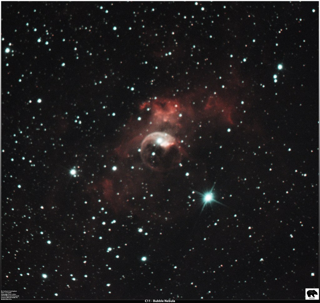 C11 – Bubble Nebula is an emission nebula located within the constellation Cassiopeia. The “bubble” visible in the center of the image is the result of a strong interstellar wind emanating from a young hot star.