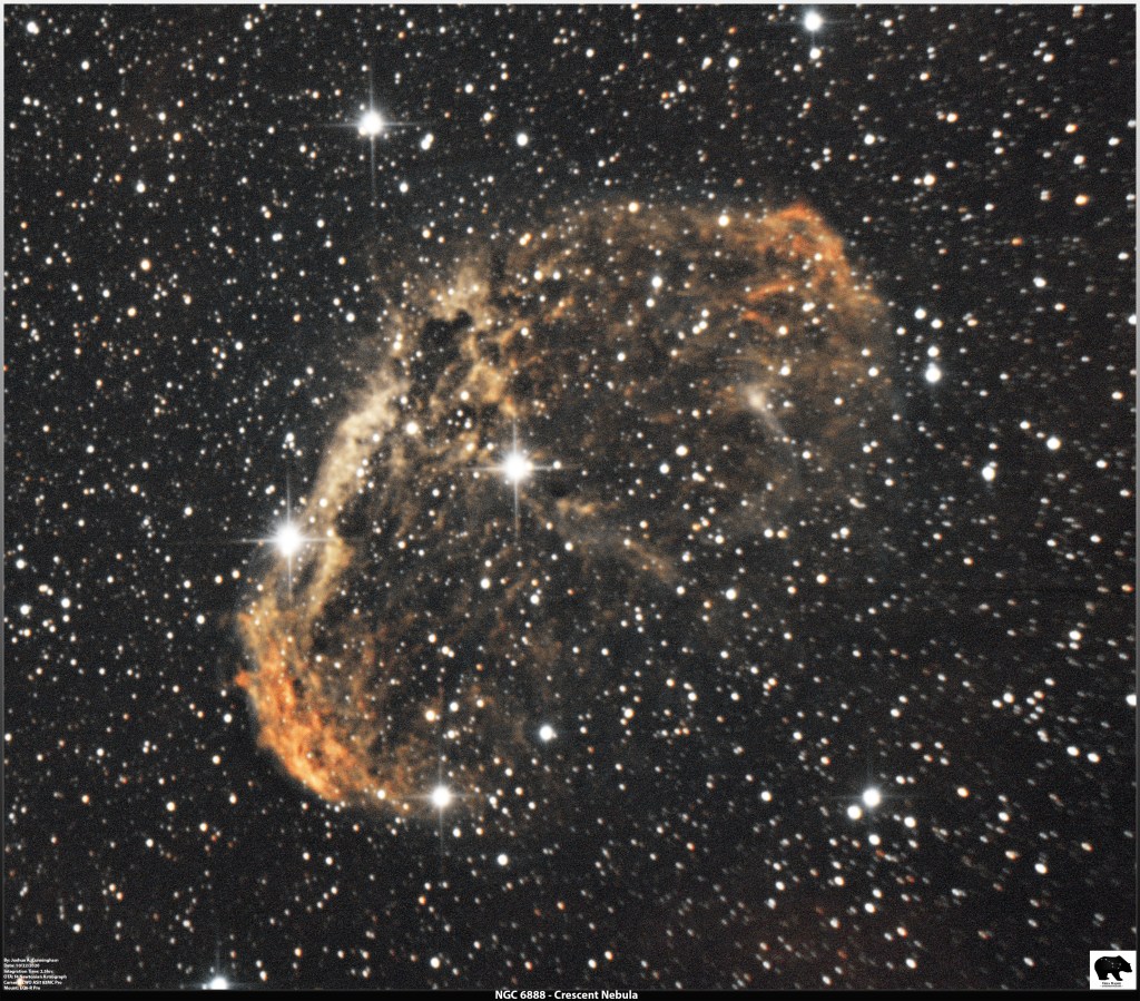 NGC 6888 – Crescent Nebula is an emission nebula located within the constellation Cygnus. The visible emissions are the result of a collision between a fast moving interstellar wind and a slower moving older stellar wind front.