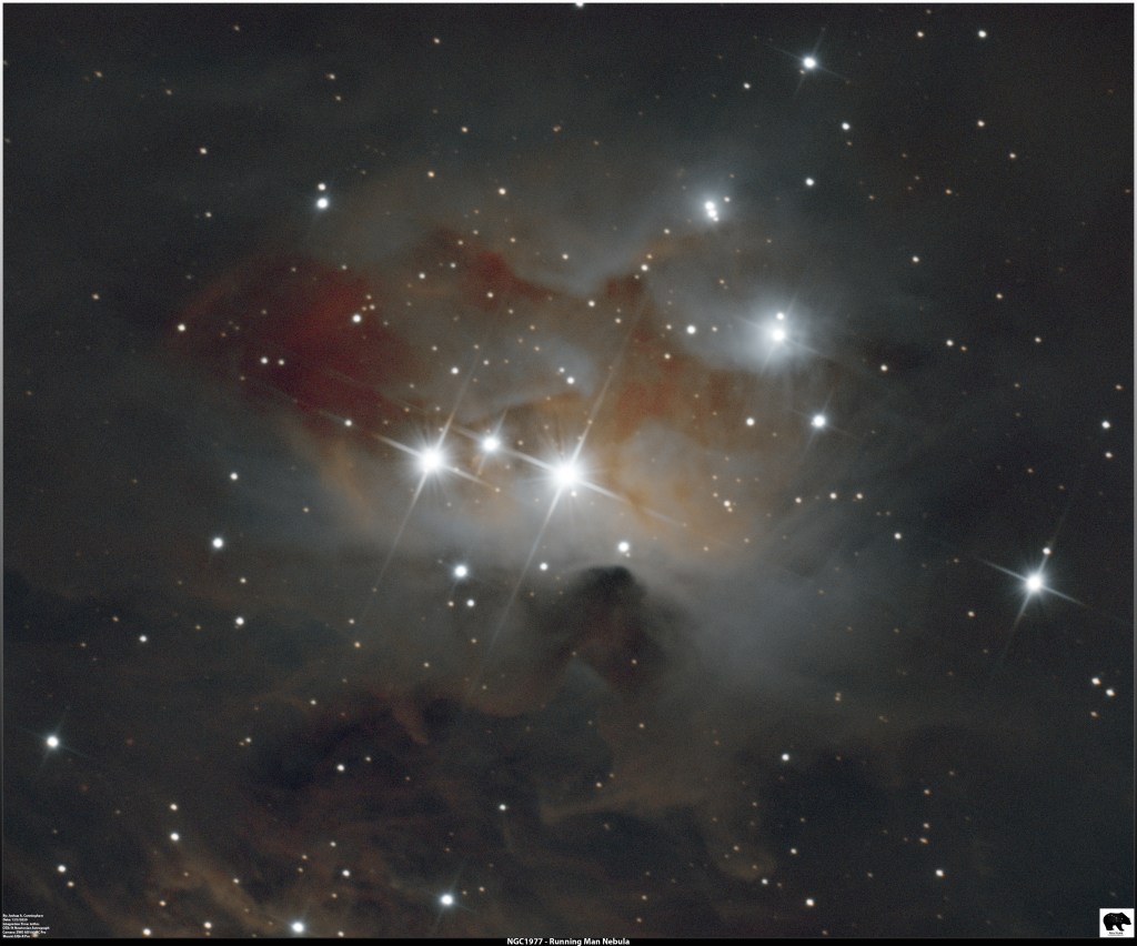 NGC 1977 – Running Man Nebula is a bright reflection nebula located within the constellation Orion. The brilliant colors are generated from intense outputs from young hot stars in the near vicinity.