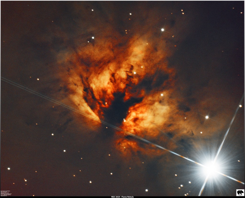 NGC 2024 – Flame Nebula is an emission nebula located within the constellation Orion. Altinak (one of the brightest stars in the night sky) shines intense radiation on a nearby gas cloud causing it to emit light. Dark gas and dust lies between us and the emission nebula resulting in the unique dark details.