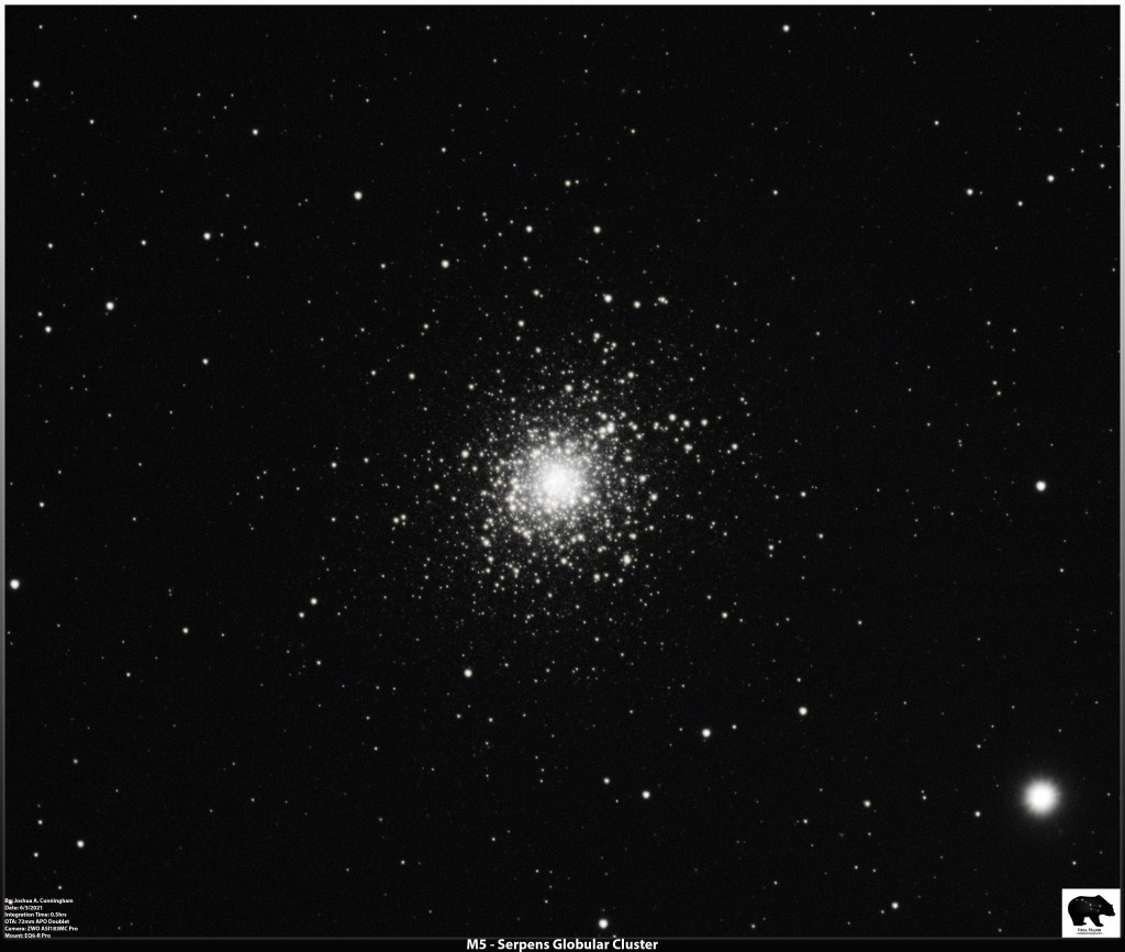 Messier 5 (M5) is a globular cluster located in the constellation Serpens. Of note, this massive grouping of stars contains a large number of variable stars that are routinely used in astronomical measurements. Globular clusters are an impressive display of the gravity’s impact.