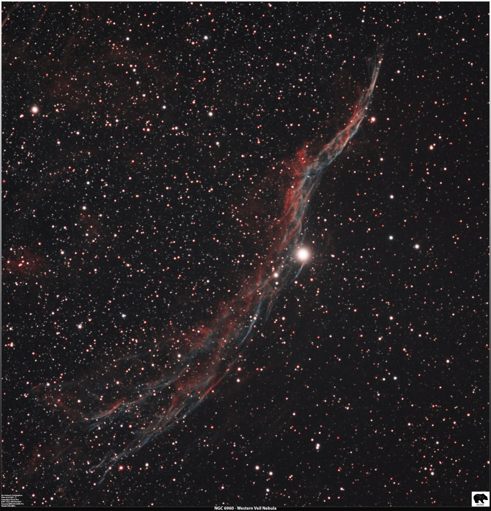 The Western Veil Nebula is a supernova remnant in the constellation Cygnus and is a compnent of the much larger Cygnus loop. The ionized gases visible in this image originated from the supernova of a star at least 20 times larger than our sun. It is estimated that at the time of supernova, it would have been visible during daylight hours on Earth and would have had an apparent brightness similar to Venus during dark hours. Careful examination of the image will reveal delicate features from the ionized oxygen (blue) and hydrogen (red).